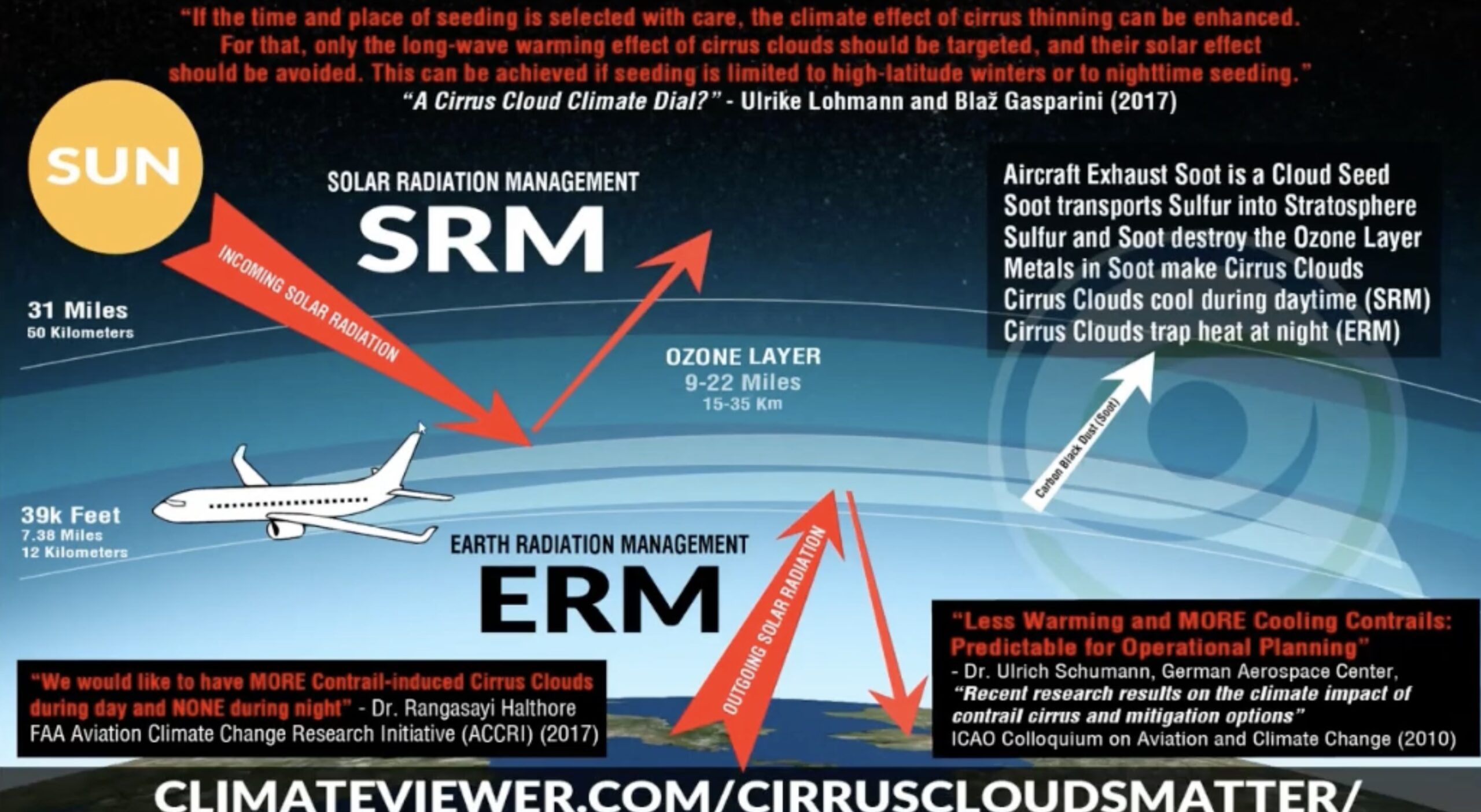 In termen van geo-engineers zijn contrails overdag productief c.q. gunstig omdat ze bij de vorming van cirrus wolken reflectie van zonlicht tot stand brengen. In de nacht zouden ze bij voorkeur niet aanwezig moeten zijn om zo de aarde optimaal te koelen. Er zijn grote bedrijven , o.a. gefinancieerd door Bill Gates, bezig om tot een gecontroleerd systeem te komen dat kan sturen op die cirrus wolken en dat zou b.v. kunnen gebeuren d.m.v. real-time monitoring van vliegtuigen en ze aan te sturen naar de gewenste hoogte om al dan niet tot wolk-vorming te komen. De volgende afbeeldingen tonen aan dat en wat er zoal op dat gebied gaande is.