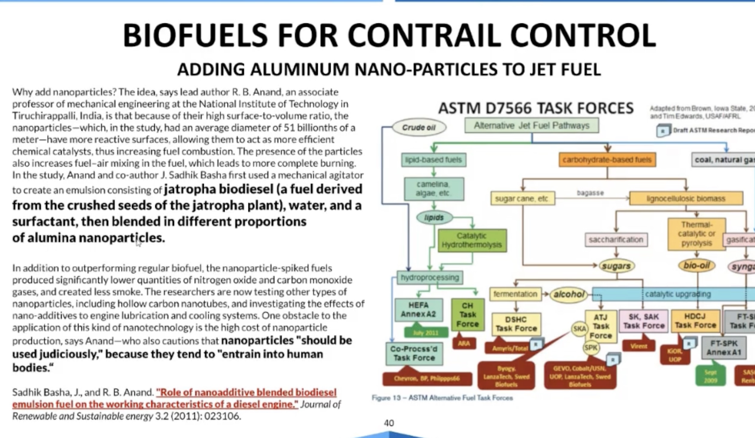 De transitie naar bio-kerosine levert volgens Lee niets op. Sterker nog, door het gebruik van nieuwe gewassen i.p.v. reststromen legt het een groot beslag op ons landbouw areaal en het aantal additieven in deze brandstoffen is ook enorm. Bovendien roepen ideeën in deze tak van sport dan weer nieuwe vragen op zoals onderstaande schermafbeelding toont. Nano-deeltjes (waar kennen we ze van?) toevoegen!
